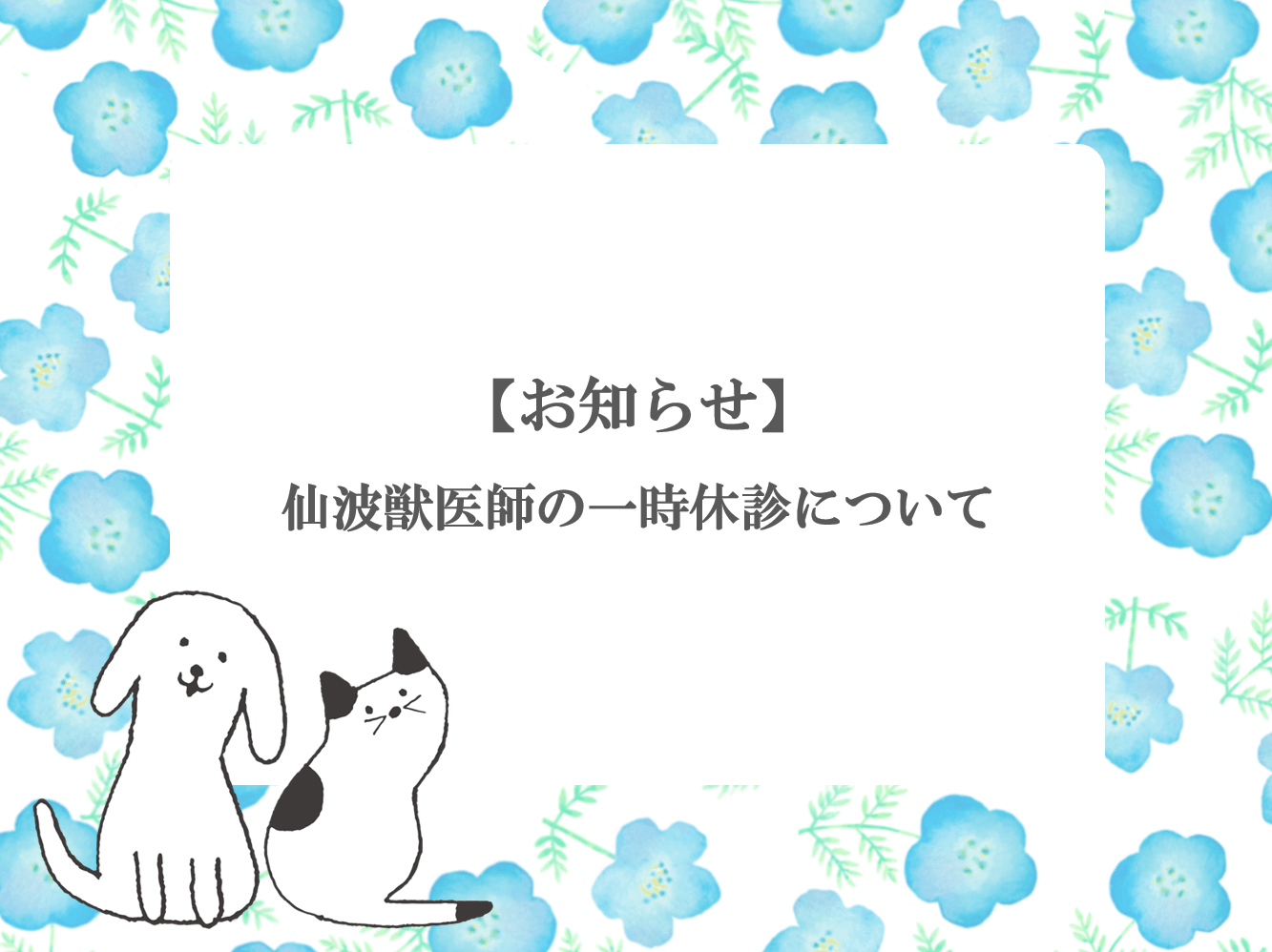 【お知らせ】仙波獣医師の一時休診について 投稿日 2025年7月3日 著者 代官山動物看護師 カテゴリー お知らせ 平素より当院をご利用いただき、誠にありがとうございます。当院勤務の仙波獣医師は、体調不良のためしばらくの間、診療をお休みさせていただいております。仙波獣医師による診療を希望されていた皆様にはご不便・ご心配をおかけし、心よりお詫び申し上げます。復帰が決まり次第、改めてお知らせいたします。なお、仙波獣医師の再診は他の獣医師が引き継がせていただきますので、ご不明な点がございましたらスタッフまでお問い合わせください。ご理解とご協力のほど、何卒よろしくお願い申し上げます。