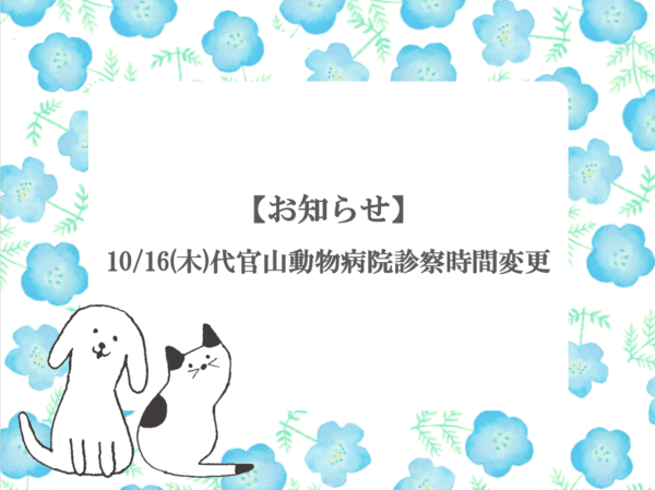 【お知らせ】代官山動物病院通常診察再開 投稿日 2025年9月12日 著者 代官山動物看護師 カテゴリー お知らせ 台風の影響で故障していた空調の修理が無事完了し、先日より通常通りの診察を行うことができるようになりました。ご不便・ご迷惑をおかけしてしまい、申し訳ありませんでした。あたたかいご理解・ご協力をいただきまして誠にありがとうございました。今後もわんちゃん・ねこちゃんたちが安心して通える環境づくりに努めていきます。どうぞよろしくお願いいたします。代官山動物病院