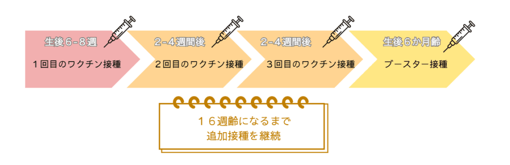 一例として最少回数でやっていくとなると、8週齢、12週齢、16週齢、6カ月齢の4回になります。